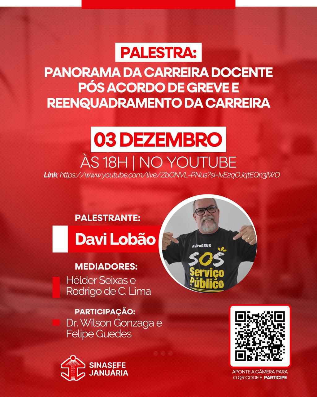 Convidamos todos interessados para participar de uma palestra ministrada por David Lobão que discutirá o tema: “Panorama da Carreira Docente Pós Acordo de Greve e Reenquadramento da Carreira”